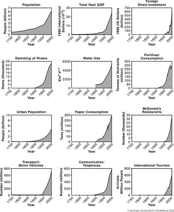Calma. Ahora le muestro 24 gráficos reales. Pulse en ellos para mayor resolución si lo desea. Es la evolución medida de distintas variables relacionadas con el clima que ha recopilado la revista New Scientist en una famosa doble ilustración (5). Muestra la evolución en el tiempo de distintas variables desde la época preindustrial. Las doce primeras son forzamientos y las 12 últimas son respuestas del sistema. Dese cuenta de que, en muchas de ellas, al principio parece que es una recta, y que la evolución es proporcional. Pero como la variable tiempo se produce con cierta lentitud y proporcionalidad al principio, si no se está al tanto despista, de forma que uno puede darse de bruces con la zona exponencial (6) y lo más seguro es que no estemos a tiempo de nada sino de procurarnos la simple supervivencia, lo que en el lenguaje correcto se denomina ‘adaptarse’. Como puede usted ver, todas esas variables se encuentran ya en comportamiento exponencial visible.