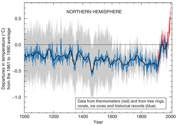 La evolución de la temperatura del hemisferio norte de la Tierra en los últimos 6.000 años se asemeja a un palo de hockey, como puede verse en la figura. Esta expresión metafórica se ha utilizado mucho en la prensa anglosajona, y es cierto que mejora al propio gráfico en términos de imagen mental a efectos de recordatorio.
