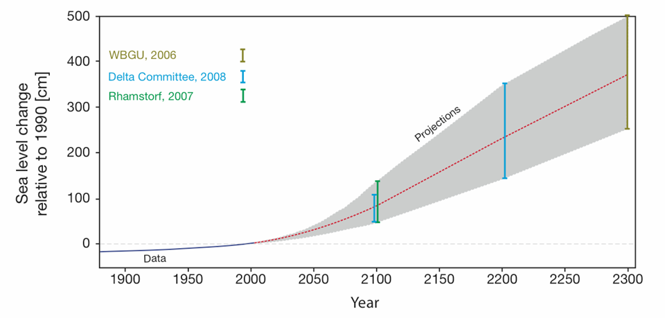 Para escenarios futuros de temperatura global examinados en el Cuarto Informe del Intergovernmental Panel on Climate Change (IPCC) [nuestro trabajo] proyecta un crecimiento del nivel del mar de 75 a 190 cm para el período 1990-2100… Para limitar el crecimiento a 1 m a largo plazo (después de 2100), tal como se ha propuesto recientemente en ámbitos políticos, son necesarias drásticas reducciones de las emisiones. Probablemente tendrían que ser mayores incluso de las necesarias para limitar el aumento de la temperatura a 2 ºC, el objetivo político hoy aceptado por muchos países. Además, nuestro análisis sugiere que estas reducciones, para que sean efectivas, deben de comenzar muy pronto en este siglo. (9)