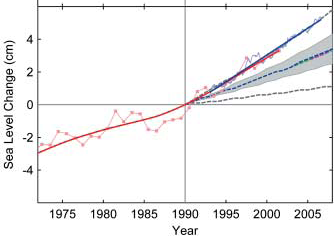 Aumento del nivel del mar. La zona sombreada corresponde a las predicciones del IPCC (Rahmstorf et al, Science, 2007)