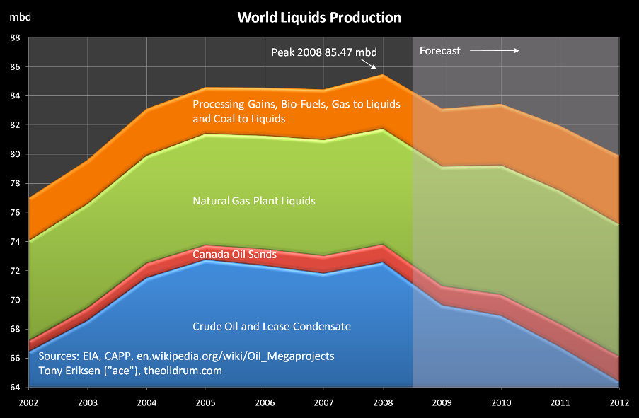 Preveo que el declive en la producción de petróleo tendrá básicamente causas económicas (aunque, por supuesto, la geología juega también su papel). La causa más verosímil a día de hoy es un incremento en los impuestos a los carburantes (combinado probablemente con disminución de los salarios y de los beneficios empresariales) establecidos por gobiernos que no podrán aguantar grandes déficits presupuestarios de forma continuada. Más impuestos y menos beneficios supondrán una disminución importante del consumo en bienes discrecionales y en la devolución de créditos. El resultado será la recesión y el aumento de créditos impagados, reduciéndose en consecuencia la demanda de petróleo. De alguna forma, la demanda actual es mucho mayor de lo que debería ser, sólo debida al elevado déficit de los gobiernos.