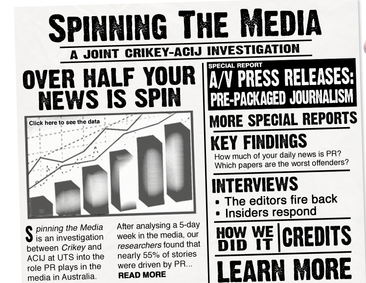 Un informe australiano de 2010 concluyó que la mitad de las noticias son 'spin' (persuasión, relaciones públicas) - Pulsar para acceder al informe