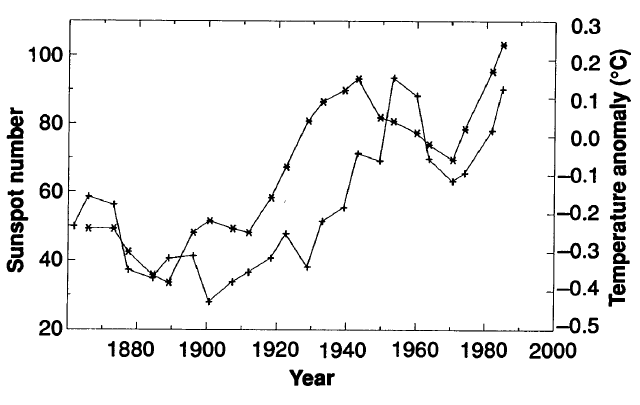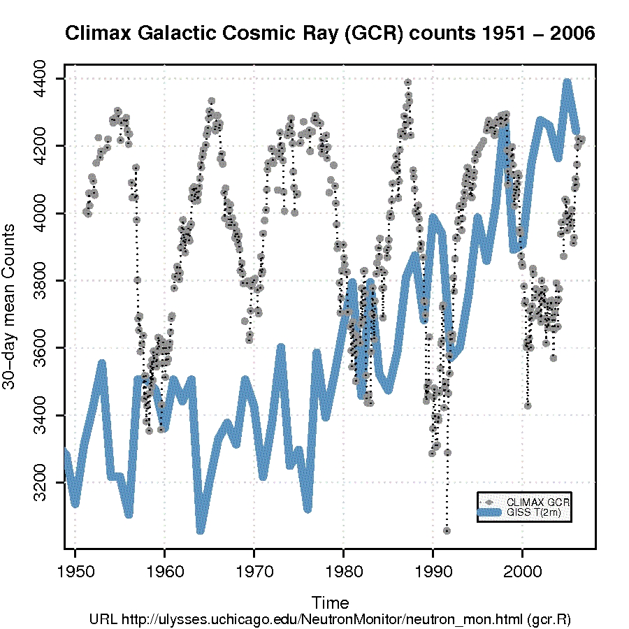 Pero más cierto es todavía que, durante el último período de viento solar intenso, no se ha observado descenso alguno de la temperatura, sino todo lo contrario (7,8). Es más: en la evolución de la intensidad de los rayos cósmicos que se mide en la Climax Station de Colorado desde principios de los años 1950 no se ha observado variación alguna a largo plazo. En cambio la temperatura ha aumentado significativamente desde entonces. Desde luego, usted comprenderá que en esta situación, es difícil atribuir influencia galáctica, por lo menos sensible, al clima de la Tierra (9).