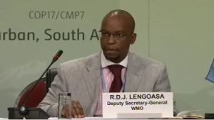 RDJ Lengoasa se refirió también al boletín emitido hace pocas semanas por la organización, donde se daba cuenta de cómo el fuerte incremento de las emisiones en 2011 ha llevado la concentración de gases de efecto invernadero a nuevos récords. Señaló que la composición actual de la atmósfera acabará llevando al planeta a una temperatura de entre 2 ºC y 2,4 ºC superior a la preindustrial, valores que los científicos consideran capaces de iniciar cambios de largo alcance, e irreversibles, en nuestra Tierra, tanto en la biosfera como en los océanos.