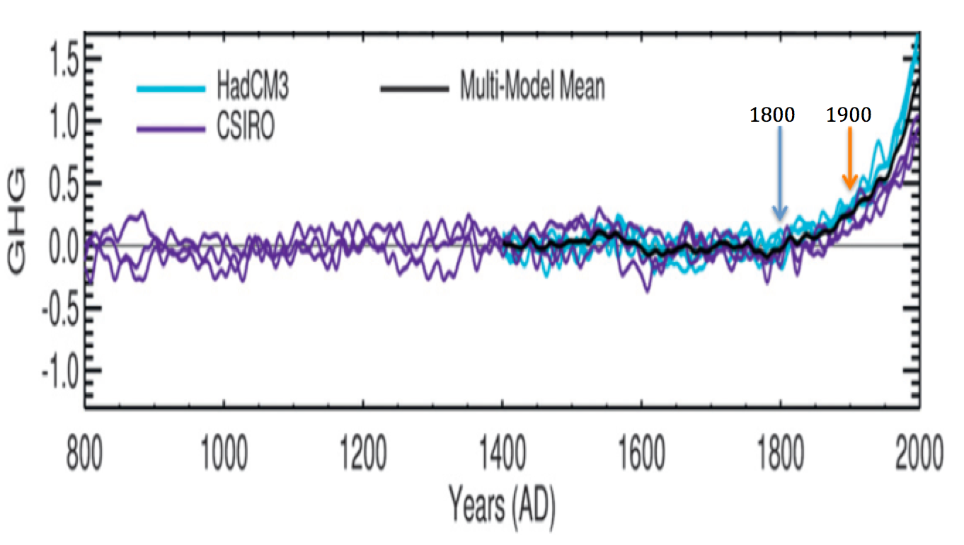 Con una salvedad. Michael Mann asegura que habría que añadir otros 0,2 entre la referencia del IPCC y la preindustrial real (3). En efecto, la reconstrucción de la temperatura de los últimos 1.200 años en el hemisferio norte muestra que, antes de 1870, la temperatura había aumentado ya alrededor de +0,2 °C (4).