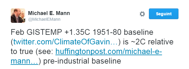 Mann 2CTuit 2C Mann2Sin embargo se asegura que si, que se han superado los 2 °C. Lo dijo, entre otros, Michael Mann, el gurú de las reconstrucciones de temperatura, a quien se le tiene por moderado en según qué círculos. Michael Mann, el artífice del “palo de hockey” y uno de los climatólogos de mayor prestigio, aseguraba en Twitter que sí que, efectivamente, en febrero se habían superado los +2 °C (ver tuits adjuntos).