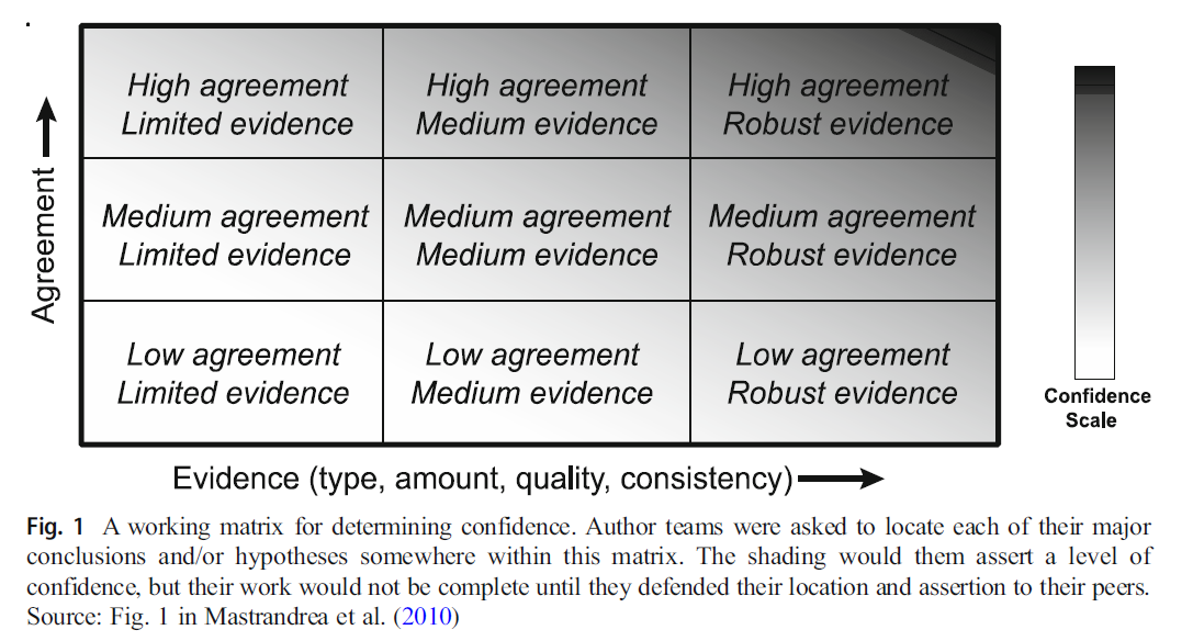 Matriz empleada por el IPCC desde esta década para determinar el nivel de confianza, mayor cuanto más oscuro es el sombreado (ref 80)