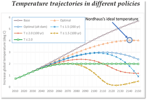 El economista del cambio climático por excelencia, William D. Nordhaus, presentó en su día un incremento de temperatura superior a +3 ºC como el óptimo para el capital (164) (la vida no debe importarle demasiado) mediante su modelo DICE (Dynamic Integrated model of Climate and the Economy), el más empleado en estos estudios.