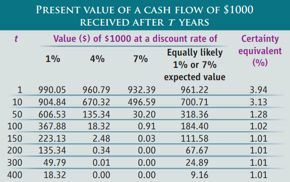 [Efecto 10c] El más evidente consiste en emplear a muy largo plazo (más de una generación) conceptos, como el de la tasa de retorno de una inversión, pensados para plazos mucho más cortos. La astucia consiste en invertir el tiempo y aplicar al futuro la denominada tasa de descuento (no confundir con la necesaria deflactación) basada en la denominada preferencia temporal pura. Con este mecanismo se consigue que el futuro valga menos que el presente, y que el futuro a medio o largo plazo ya no valga prácticamente nada según sea la tasa de descuento elegida (ver tabla adjunta). Moderación directa, explícita, producto de la propia disciplina, aspecto que no es tenido en cuenta, ni tan solo conocido, por los negociadores políticos ni desde luego por el público en general.