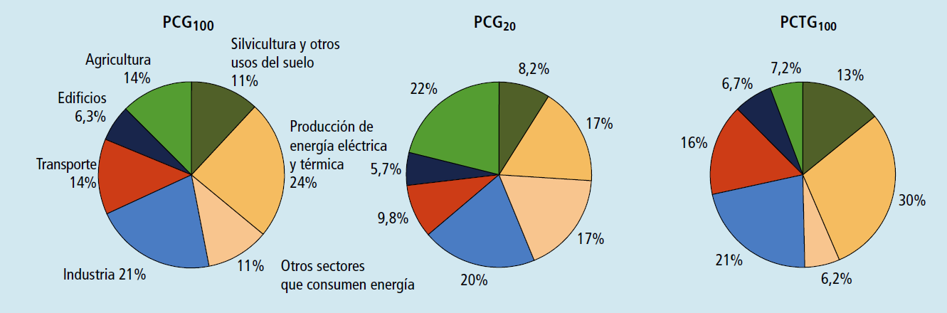“Si se utilizan los valores más recientes de potencial de calentamiento global a 100 años (PCG100) del Quinto Informe de Evaluación {GTI 8.7}, en lugar de los valores de PCG100 del Segundo Informe de Evaluación del IPCC, los totales de las emisiones mundiales de gases de efecto invernadero serían ligeramente superiores (52 GtCO2-eq/año) y los porcentajes de emisiones distintas al CO2 serían del 20% para el metano (CH4), el 5% para el óxido nitroso (N2O) y el 2,2% para los gases fluorados.”(330)