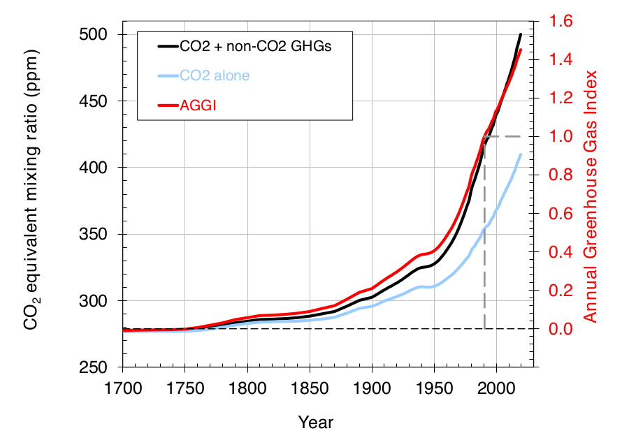 Fig. 2. La concentración atmosférica de GEI, en CO2 equivalente, ha superado ya las 500 ppm. Imagen NOAA [ref: 765]