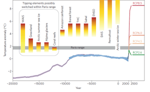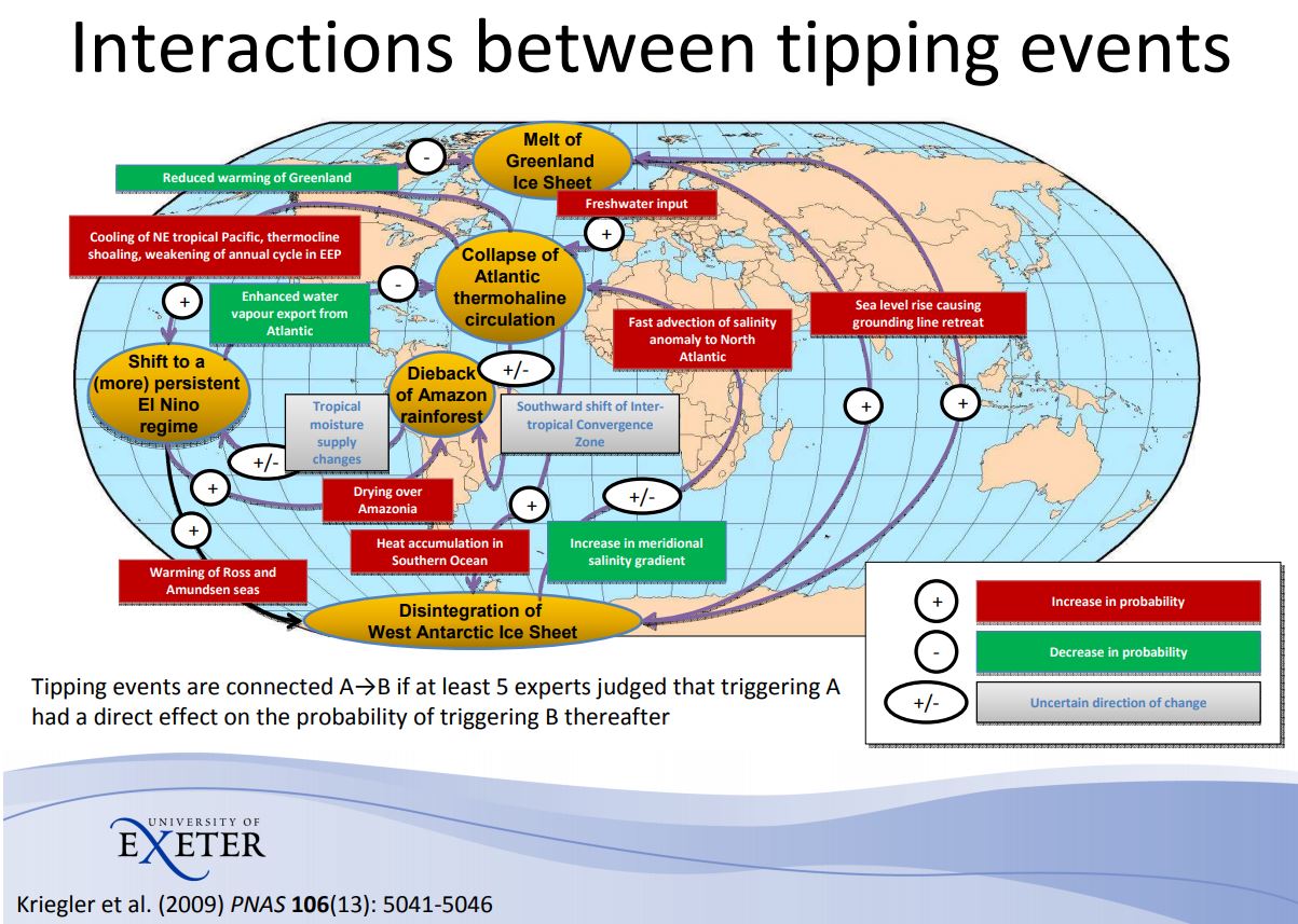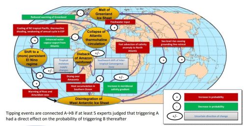 Es decir: algunos tipping points han sido ya rebasados (ver más adelante). Son irreversibles en la práctica y, su activación provoca un efecto dominó que conduce a que, sin remedio, el sistema Tierra se reorganice completamente y que su aspecto y habitabilidad esté condenada a desaparecer tal como hoy la conocemos.