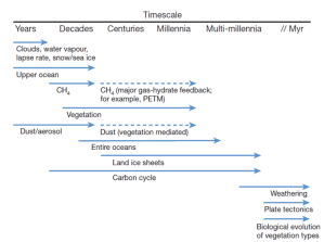 Fig. 9.- Escalas temporales de activación de cada uno de los lazos de realimentación del sistema climatico. Se incluyen también los lazos negativos, aquellos que tienden a estabilizar el sistema o, al menos a retrasar su proceso de desestabilización [ref: 797].