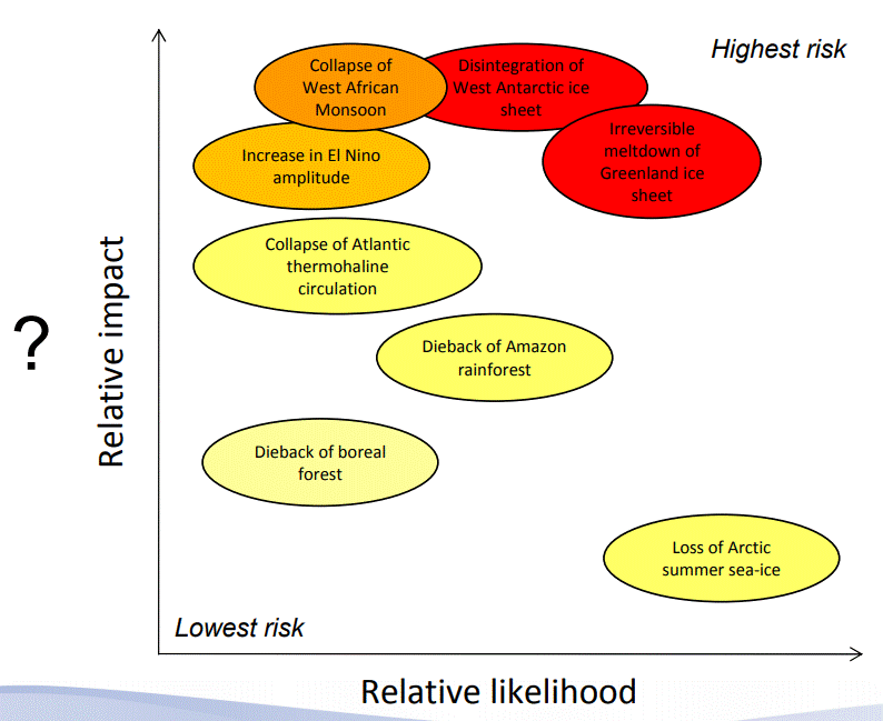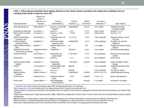“1) Distintos subcomponentes del sistema climático podrían desestabilizarse en este siglo debido al forzamiento antropogénico; 2) Groenlandia y la Antártida occidental son, probablemente, los subsistemas de mayor riesgo; 3) En principio es posible anticipar algunos TP, pero se carece de una resolución suficientemente alta y de mediciones de plazo largo … 5) Es necesaria una mejor comprensión de los fenómenos para poder ayudar a los responsables de la formulación de políticas a «evitar lo inmanejable y gestionar lo inevitable».”769 [énfasis añadido]