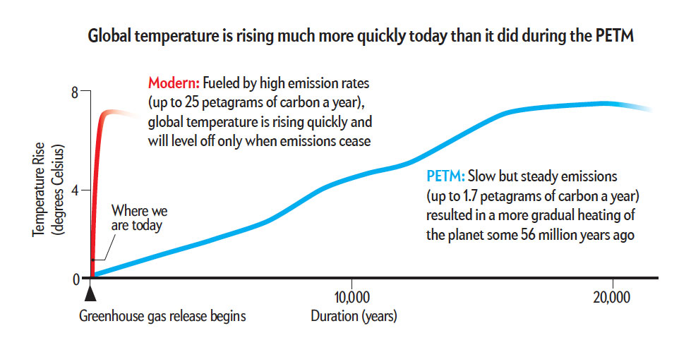 Fig. 3. La velocidad actual de aumento de la temperatura es órdenes de magnitud superior a la del Máximo Térmico del Paleoceno-Eoceno, hace unos 56 millones de años [ref: 775]