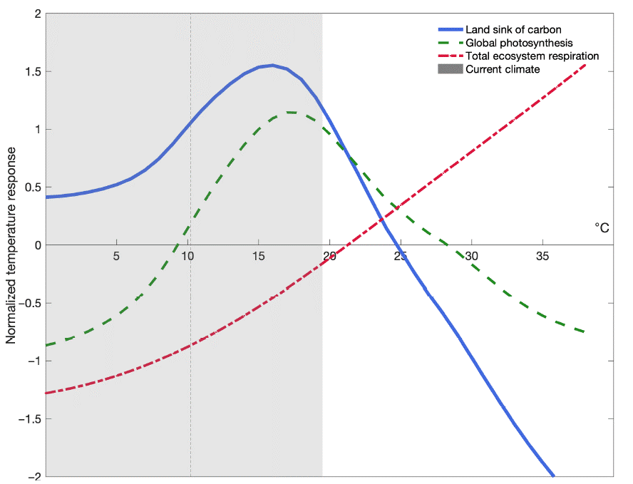 Desde el pasado mes de enero tenemos una buena aproximación a este fenómeno de inversión en conjunto de la biosfera, ahora a nivel global – salvo océanos – que resulta consistente con lo anterior. Un paper en Science Advances de 2021 titulado How close are we to the temperature tipping point of the terrestrial biosphere?[7] nos muestra que, en el trimestre más cálido, el máximo térmico de la fotosíntesis global fue superado ya en la década pasada, y que el comportamiento exponencial de la respiración – el flujo de CO2 de las hojas hacia la atmósfera, una parte del cual es extraído de los suelos – llevaría a que la capacidad de absorción de la biosfera terrestre haya disminuido a la mitad ¡en 2040! El trabajo muestra además una cuestión de gran importancia: no hay (por lo menos hasta ahora) signos de aclimatación, es decir, de adaptación de las especies al nuevo clima820. Una dura muestra de que la velocidad del cambio climático en curso no permite a la biosfera llegar a tiempo de sobrevivir en términos de su esperable evolución adaptativa.Y cuidado porque, ya fuera de plazo, el próximo informe del IPCC previsto para el año en curso (probablemente) no tendrá en cuenta este trabajo, basado en una aplicación novedosa de la técnica termodinámica denominada macromolecular rate theory (MMRT)821, capaz de presentar transiciones críticas. Esta aplicación concreta no habría sido incorporada en los modelos, si bien en otras áreas si es empleada en los Earth System Models mediante la ecuación de Arrhenius, un caso particular aquí generalizado.