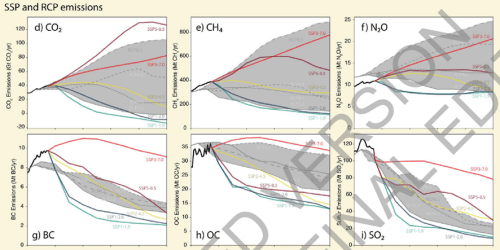 Creo que si se analizan son una prueba contundente de lo absurdos que son los escenarios manejados. ¿Cómo se cambia la tendencia de crecimiento de más de un siglo del metano de la noche a la mañana, del BC (black carbon), del OC (organic carbon), NO2, CO etc.? Vemos que algunos efectivamente parecen estar descendiendo (aunque no a tan alto ritmo) como el SO2, lo que lleva a cierta paradoja que veremos, y otros han ralentizado su crecimiento como el CO o los compuestos orgánicos volátiles (NMVOC), pero el lustro que va de 2015 –donde arrancan los escenarios futuros- y el presente, ya ha desmentido los escenarios SSP1-1.9 y SSP1-2.6 y en algún caso incluso el SSP2-4.5.