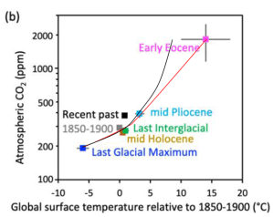En ella se representa la relación entre el nivel de concentración de CO2 en la atmósfera y la temperatura global relativa a la que se toma como “preindustrial”. De esta gráfica surgen varias observaciones importantes: 1ª la relación entre nivel de CO2 y temperatura no es lineal (ojo que la escala de CO2 no es lineal). Tenemos medidas indirectas aproximadas de la temperatura y más directas del nivel de CO2 del pasado. Las medidas del comienzo del Eoceno son poco fiables dada su antigüedad y así lo denota su rectángulo de error. Además, a mí me parecen que exageran la temperatura alcanzada (entre 10 y 18ºC más que ahora) por el sesgo teórico que tengo, ya que supondrían muy poco control gaiano, lo que sería una espina en mi teoría Gaia. En cualquier caso, vuelvo a copiar la gráfica y pongo a mano una curva roja que pasa bien por los centros de los puntos del pasado y una curva negra que pasa bien por los puntos del pasado más cercano y mal por el Eoceno: