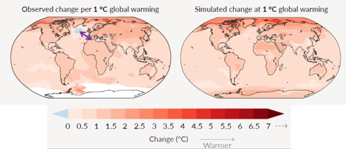 El mapa de la izquierda es el cambio observado con un calentamiento global de 1ºC (reciente pasado) y el mapa de la derecha un promedio simulado por los modelos a esa temperatura. Si observamos con detalle a escala regional y comparamos un mapa con el otro, vemos que los parecidos son aceptables a este incremento global de la temperatura, aunque no del todo precisos a escalas subregionales. Cuando comparamos los dos mapas para algunas regiones vemos que los contrastes son más importantes que lo que nos marcan los modelos. Como si los modelos generaran una dilución de los contrastes/gradientes locales en sitios importantes. Por el contrario, vemos en África pocas diferencias en el aumento de la temperatura (el mismo color en todo África en el mapa de observaciones), mientras que los modelos prevén más calentamiento en el Sáhara y menos en la zona ecuatorial (¿Es posible que haya pocas medidas en África para hacer esa discriminación y las observaciones tiendan así a diluir los contrastes en algunos casos?). Destacan en cualquier caso las diferencias en el sur de Groenlandia, donde los modelos prevén un ligero aumento de la temperatura y las observaciones en cambio un ligero descenso. Esta zona tiene su importancia regional y global porque es uno de los motores de la cinta transportadora oceánica. Por otro lado, las tormentas y otros fenómenos meteorológicos que estamos viviendo por el gradiente entre esa zona y Europa son mayores de lo que prevén los modelos. ¿Podemos esperar pues que los modelos tienden a diluir efectos catastróficos locales? Veremos que sí.