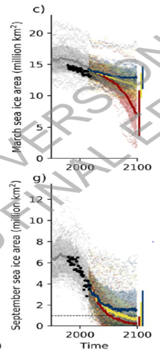 En ella vemos el detalle de las pérdidas esperadas de hielo ártico en septiembre (la más discutida) y también la de marzo, cuando ocupa la máxima extensión. Cabe señalar que la extensión mínima está ocurriendo en septiembre, pero cada vez más hacia final del mes, con lo que quizás en el futuro esta se termine dando en octubre y necesitaríamos no la gráfica de septiembre sino la del mínimo. Los puntos negros son las observaciones, las zonas grises el pasado modelado y la curva gris el promedio de los modelos en el pasado. En septiembre vemos como esta vez –no fue así en el AR5-el promedio de los modelos no sigue muy mal las observaciones porque se han mejorado y/o porque se han parametrizado mejor para su adecuación a la realidad. Algunas observaciones del pasado reciente se sitúan muy por debajo de la línea gris promedio de los modelos, haciendo que volvamos a sospechar que los modelos posiblemente sean todos ellos optimistas. Pero si nos fijamos en la gráfica de arriba, de marzo, vemos como aquí se les ha escapado y que no pueden todavía ajustar los modelos aún para que sean coherentes a la vez con las observaciones de septiembre y marzo. Vemos cómo la línea gris está por encima de las observaciones en alrededor de 1 millón de Km2 (dos veces España). Por lo que si se parametrizaran los modelos para marzo o se escogieran aquellos modelos que dan bien en marzo, veríamos que los modelos para septiembre llevan mucho antes a la pérdida de hielo que los reflejados en las curvas escenarios-tipo de colores.