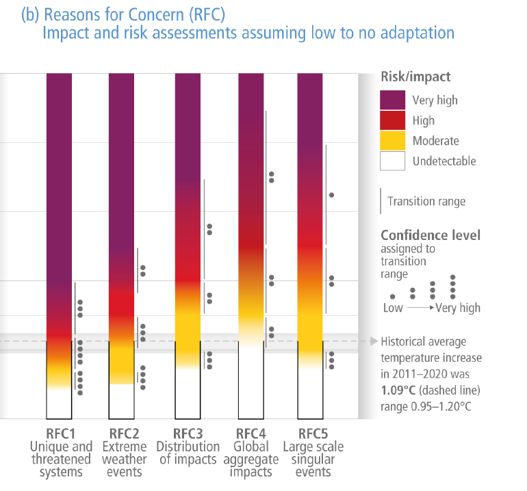 Un problema, y ya llevamos un lustro intentándolo, es que cuando quieres publicar en una revista de buen impacto esa coherencia entre las gráficas que presentas (las Reasons for Concern) y los impactos, por ejemplo, sobre la economía humana, sencillamente nos lo rechazan sistemáticamente, y hasta ahora, los revisores. Quizás el que esos semáforos sean en este último informe tan contundentes, abra algún resquicio, seguimos intentándolo. No son solo los políticos y una sociedad aletargada, la dilución empieza en la propia ciencia y su método estándar como bien sabes y has argumentado más de una vez. Las «trampas sociales» empiezan en los mismos artículos científicos.