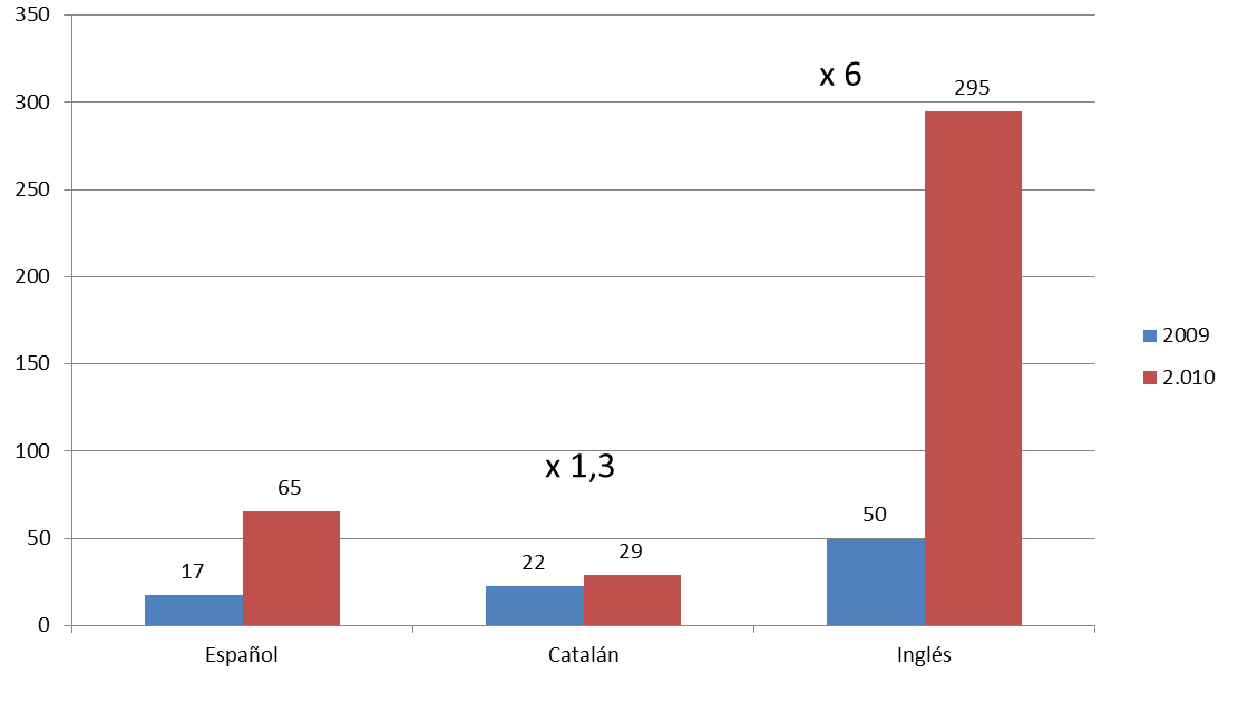 Una manera d’estimar la penetració del negacionisme climàtic a una comunitat lingüística consisteix en utilitzar Google per a veure quants textos relacionats amb el canvi climàtic inclouen paraules habitualment associades al negacionisme tals com “falòrnia”, “estafa”, “socialisme”, etc., i deduir-ne el que podem anomenar ‘índex de negacionisme’. Aquest mètode no ens permet treure conclusions a partir dels valors absoluts, però les comparacions entre idiomes i intertemporals poden ser vàlides. El resultat (orientatiu) ens mostra la importància relativa del negacionisme climàtic a Internet en anglès, castellà i català, i ens indica que té un impacte creixent en les tres llengües al llarg del temps, per bé que molt limitat en català.