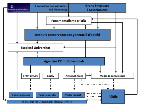 El negacionisme climàtic, s’haurà endevinat, té com a origen, està finançat i es suporta en la poderosa estructura de promoció del pensament neoliberal, que sabem triomfant. Empra les mateixa tipologia d’estructures, per bé que ha desenvolupat un nombre important de terminals específics que, això no obstant, estan sota la supervisió de la xarxa tradicional. El gràfic dona una idea de la composició d’aquesta maquinària.