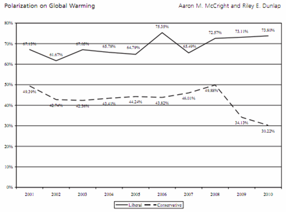 Polarització de la percepció de la gravetat del canvi climàtic als EE.UU segons ideologia política. Vegi’s la caiguda de 2009 al costat republicà, quan el negacionisme es va fer especialment actiu en ocasió de la cimera de Copenhague (McCright and Dunlap, 2011 – ref. 95)